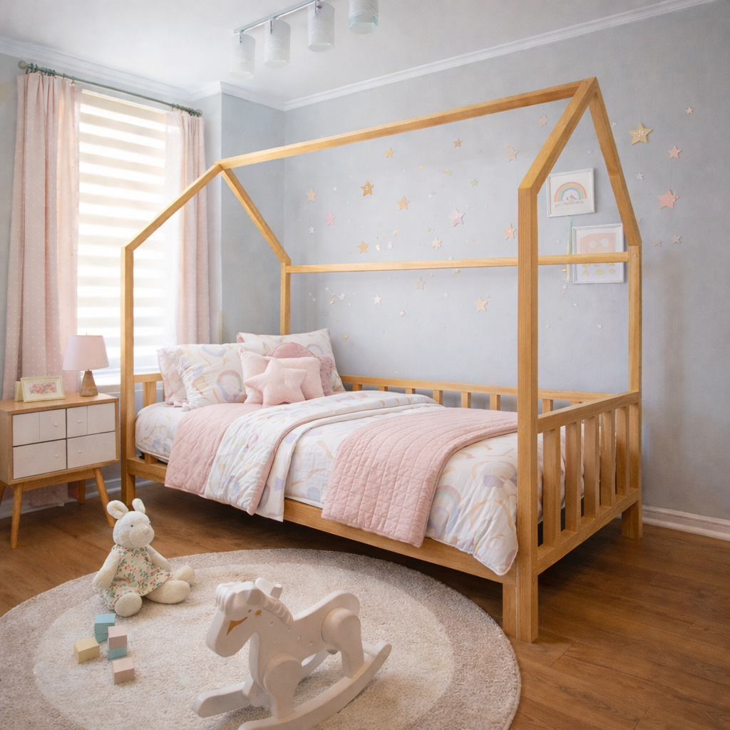- Madera de Pino Cepillado de Alta Calidad: La cama «CASITA» está fabricada íntegramente con madera de pino cepillado, un material natural, resistente y duradero, que proporciona un acabado suave y estéticamente atractivo, ideal para cualquier habitación infantil.
